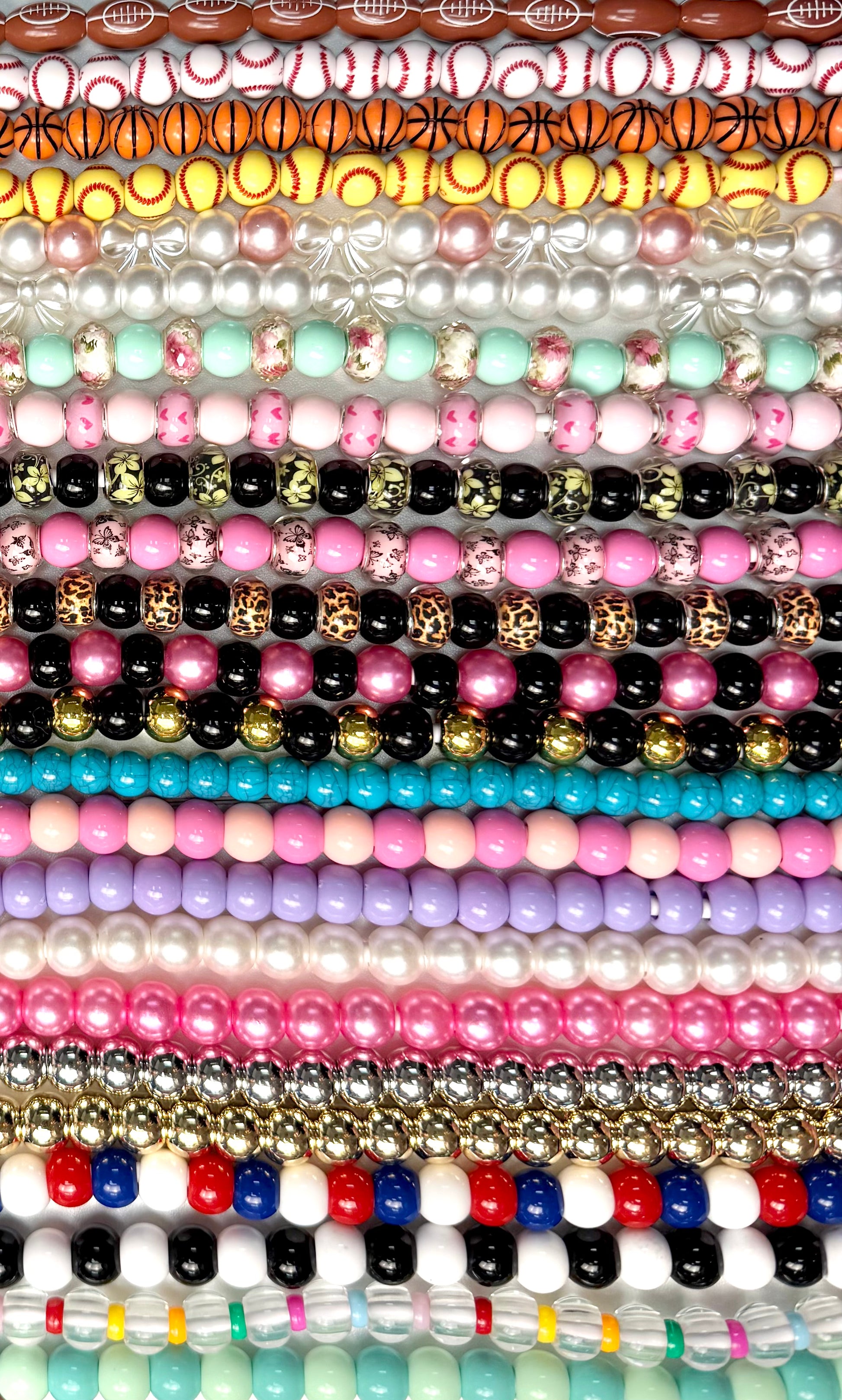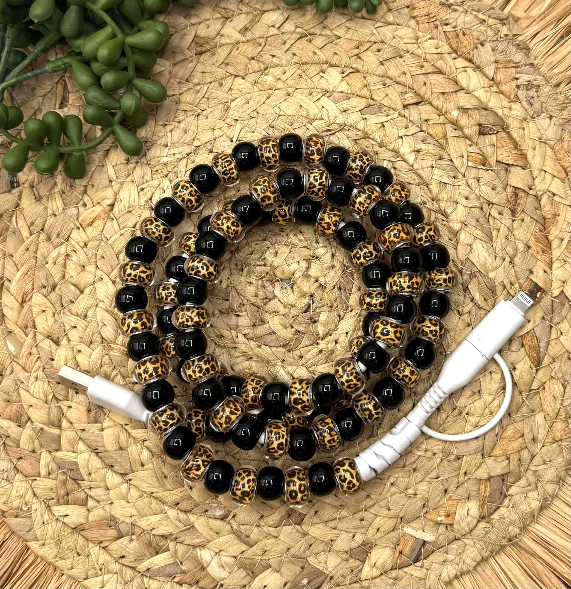 This Charger comes with a USB-USB-C/Lightning Cord. The Beads Acrylic and are Preloaded. 1 meter in length (slightly over 3 feet)