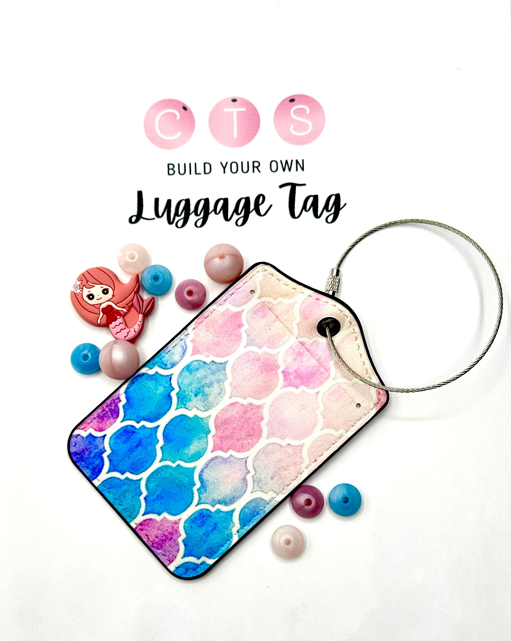 Mermaid Kit Includes: 1 Luggage Tag, 1 Wire Loop, 2 Pink Pearl 15mm, 2 Blue Pearl Lentils 15mm, 2 Purple Pearl Lentils 2 Pink Pearl Lentils, 1 Pink Magical Mermaid