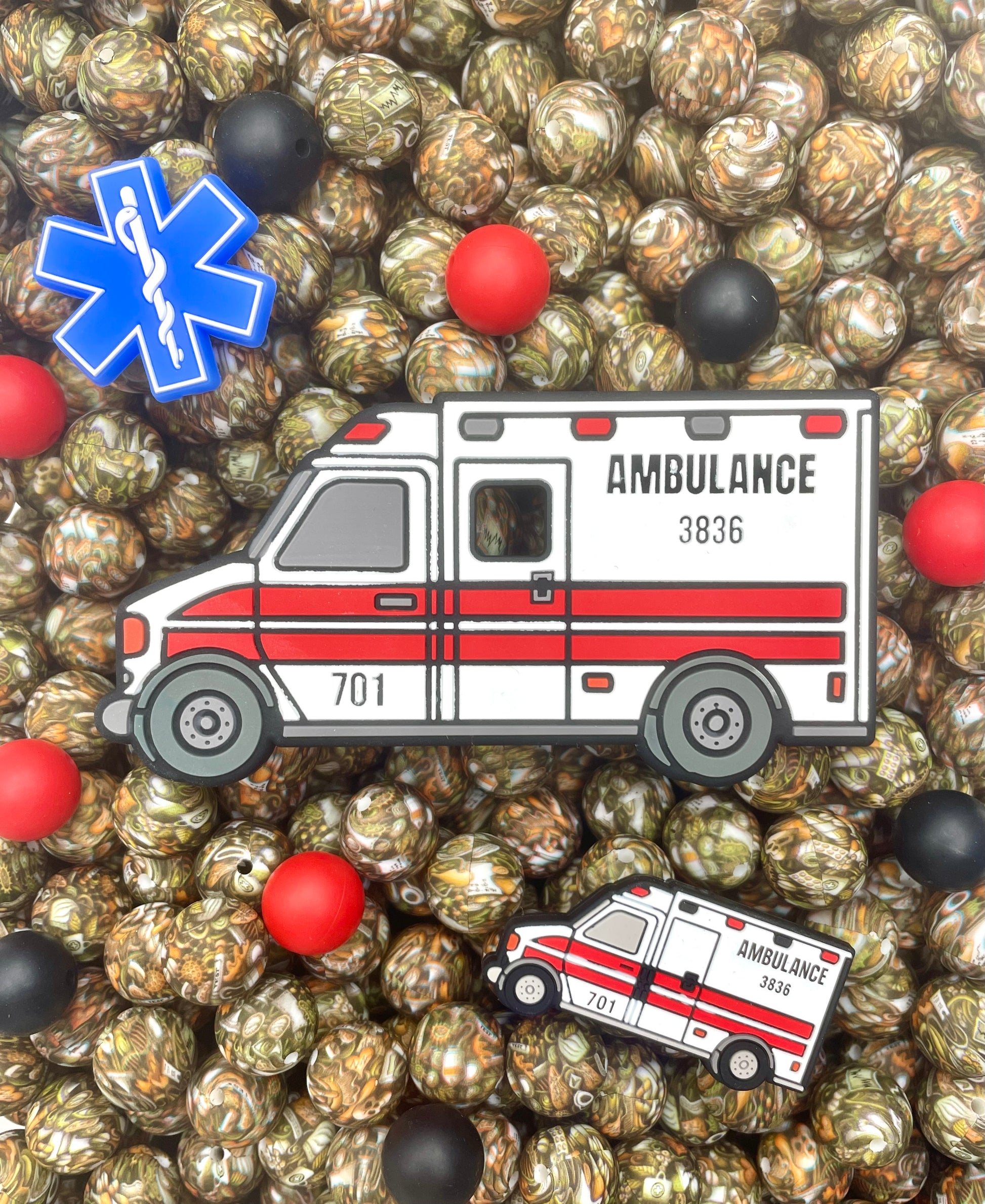 This Mix includes 1 Ambulance, 1 Ambulance Focal, 1 Star of Life Focal, 10 Salty Medic printed 15mm, 5 Scarlett 15mm, 5 Black 15mm beads.