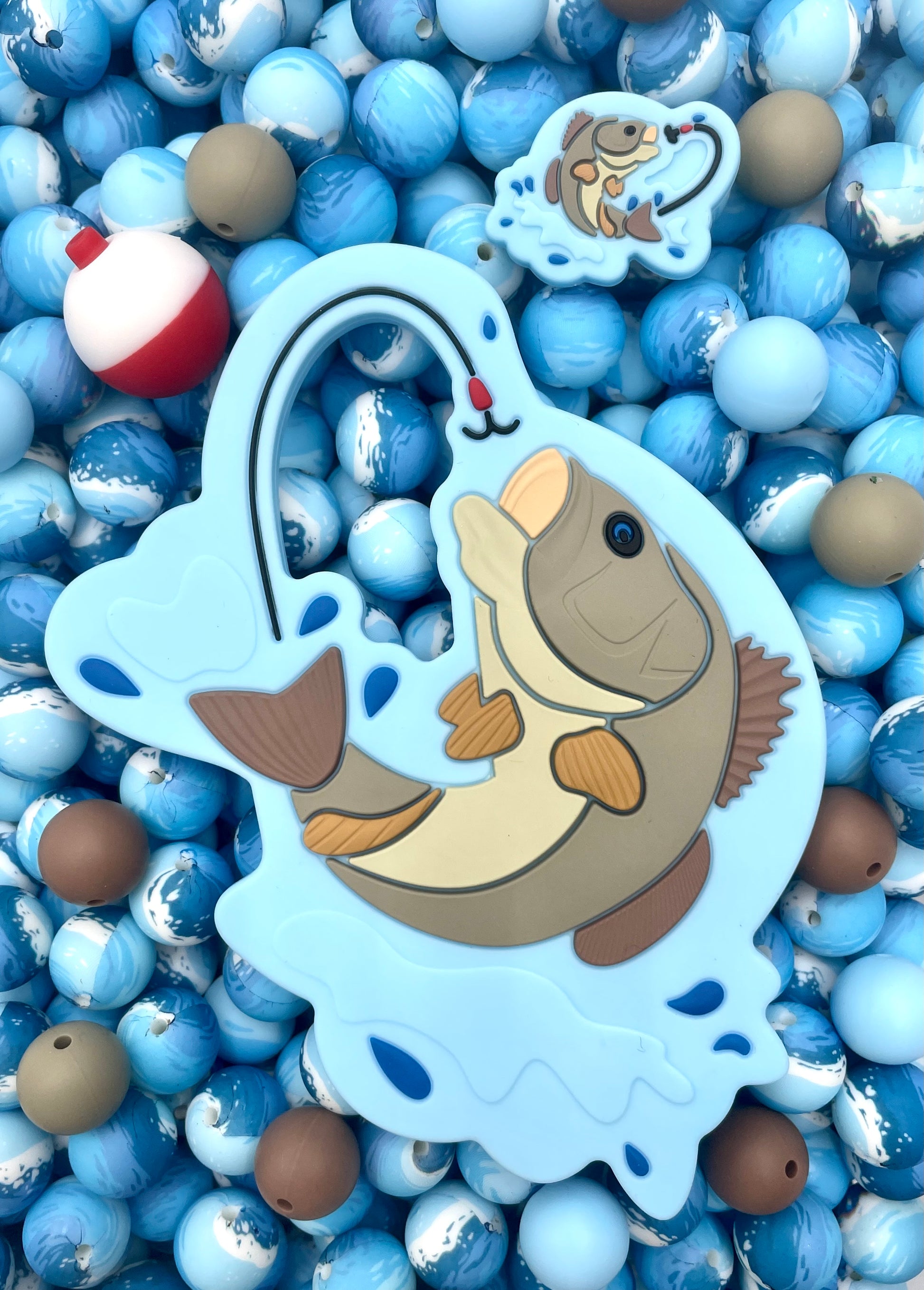 This Mix includes 1 Big Mouth Bass Teether and focal, 1 bobber focal, 5 Surf Rider 15mm, 5 Brownie, 5 Silver Sage and 5 light blue 15mm beads.