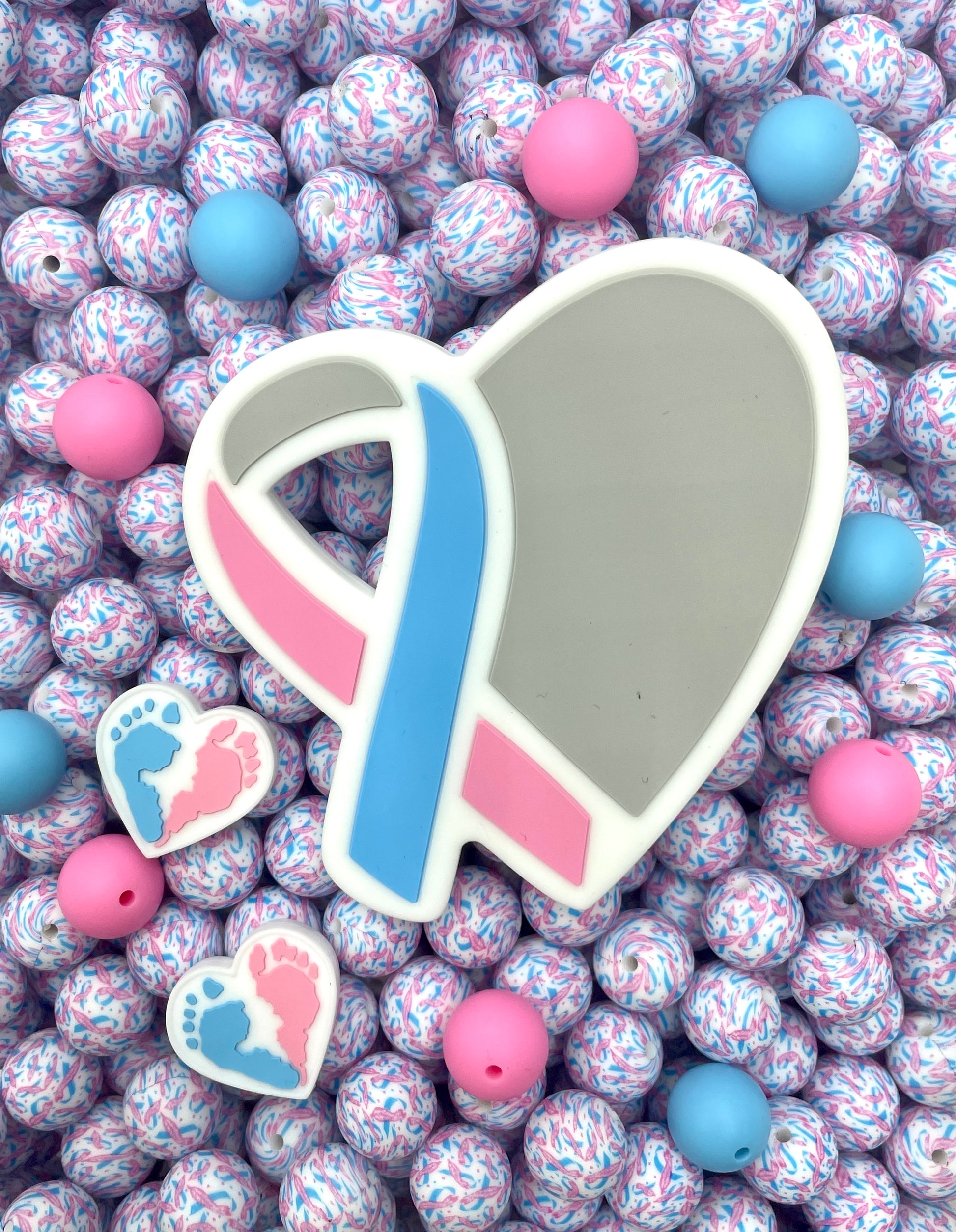This Mix includes 1 Keepsake Teether, 2 Footprints Focals, 10 Remembrance Printed 15mm, 5 Pink or Super Shimmer 15mm, 5 Blue or Super Shimmer 15mm beads.