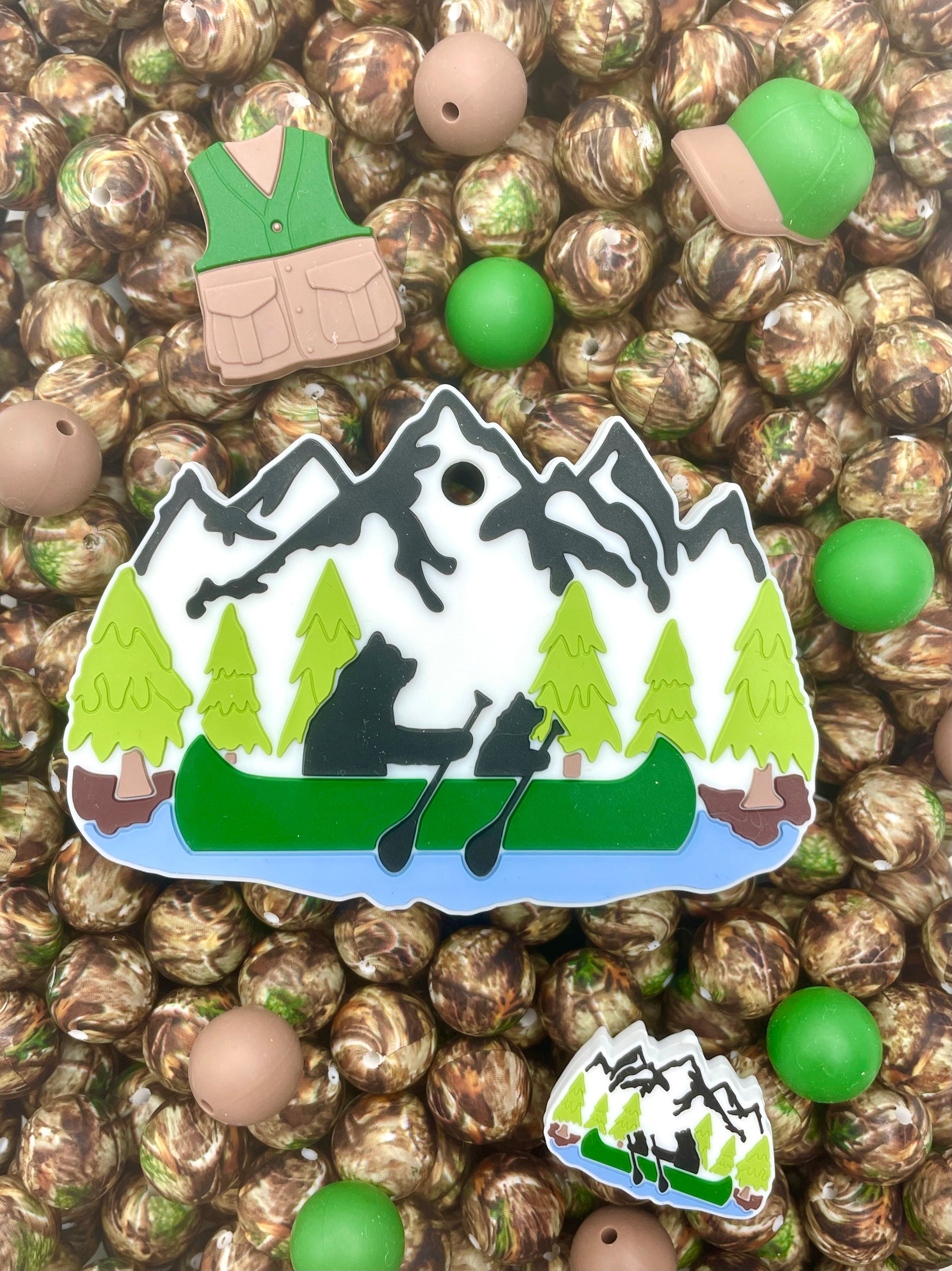 This Mix includes 1 Life is an Adventure Teether, 1 Life is an Adventure Focal, 1 Fishing Hat focal, 1 Fishing Vest Focal, 10 Classic Camo 15mm, 5 Pine Barrens 15mm, 5 Brownie 15mm beads.