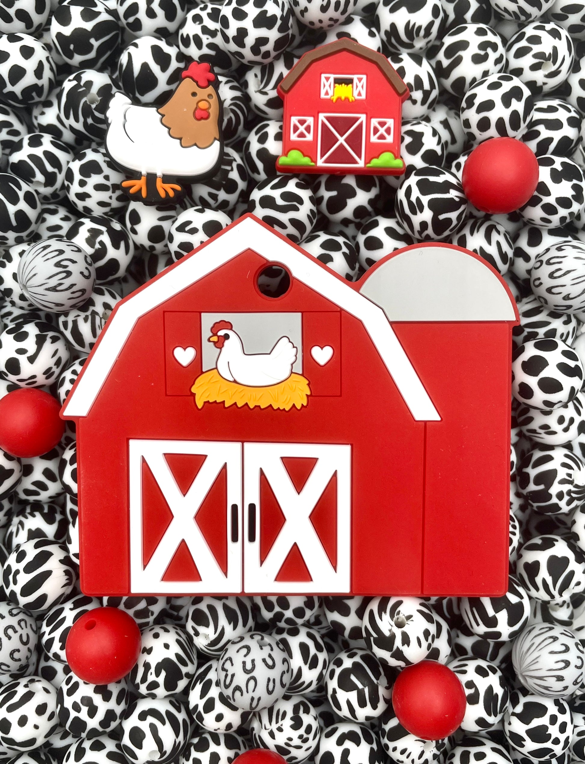 This Mix includes 1 McMauro Barn Teether, 1 Chicken Focal, 1 Barn focal, 10 Cow Printed 15mm, 5 Hoofbeats 15mm, 5 Scarlet 15mm beads.