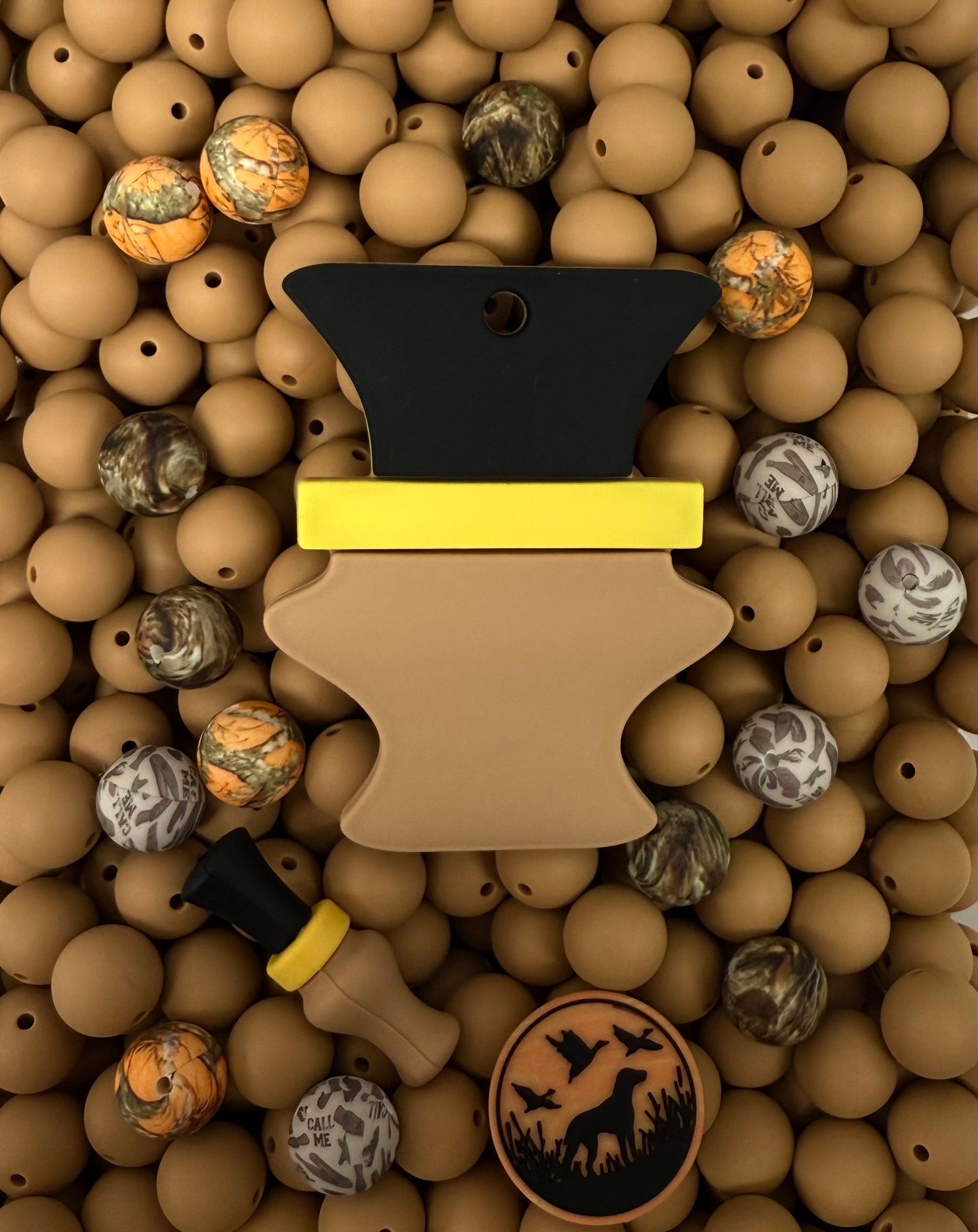 This Mix includes 1 Duck Call Teether, 1 Duck Call Focal, 1 Duck Hunting Focal 5 Pastry Shell 15mm, 5 Duck Call 15mm, 5 Orange Classic Camo Printed 15mm Beads, 5 Classic Camo Printed 15mm Beads