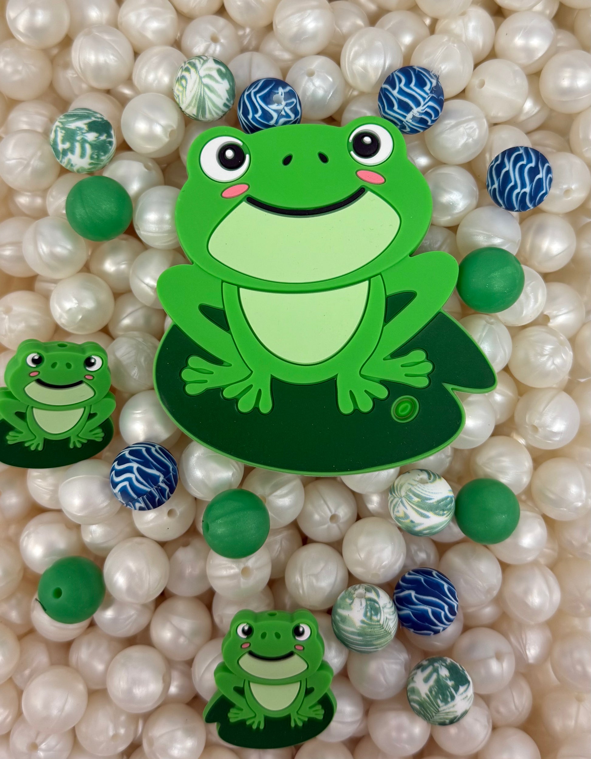 This Mix includes 1 Frog Teether, 2 Frog Focals ,5 Pearl 15mm, 5 Shamrock Pearl 15mm, 5 Fern Valley 15mm Beads, 5 Poseidon 15mm Beads