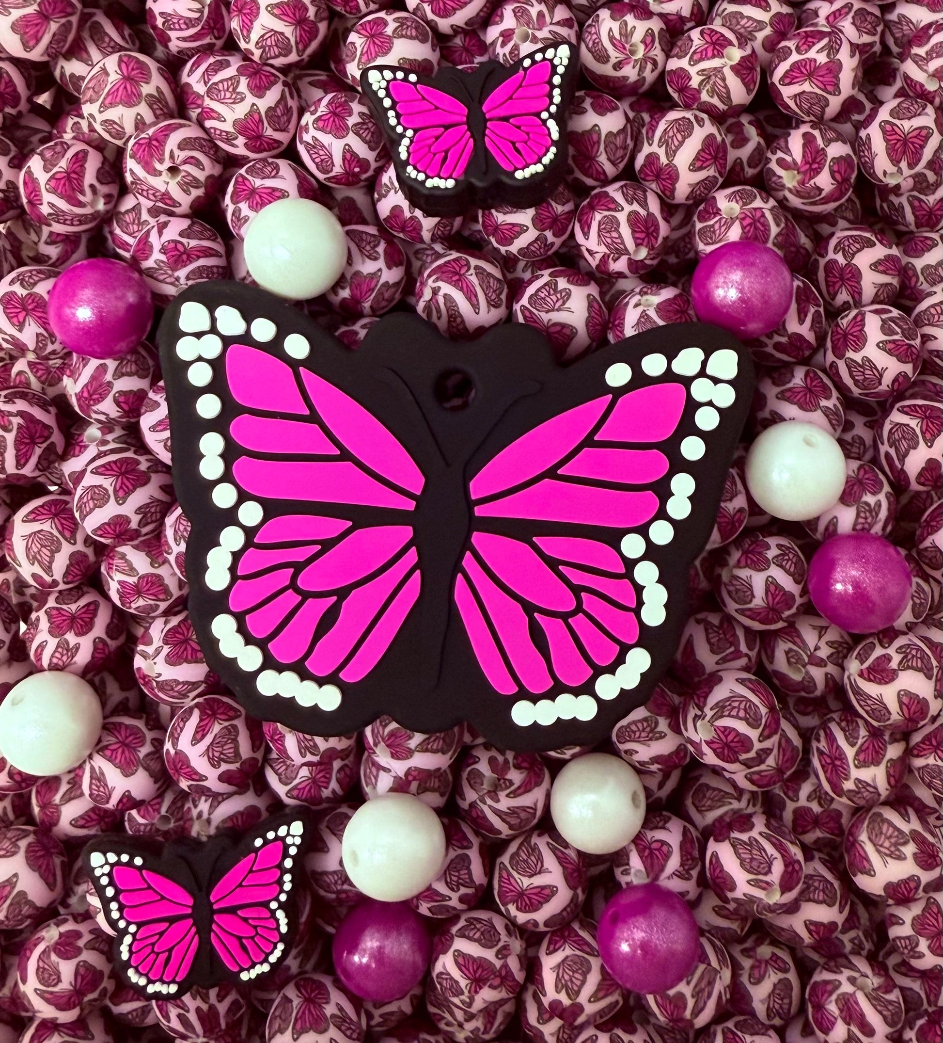 This Mix includes 1 Bright Pink Monarch Butterfly Teether, 2 Bright Pink Monarch Butterfly Focals, 5 Orchid Super Shimmer 15mm, 5 White Super SHimmer 15mm, 10 Pink Butterfly Kisses Printed 15mm Beads.