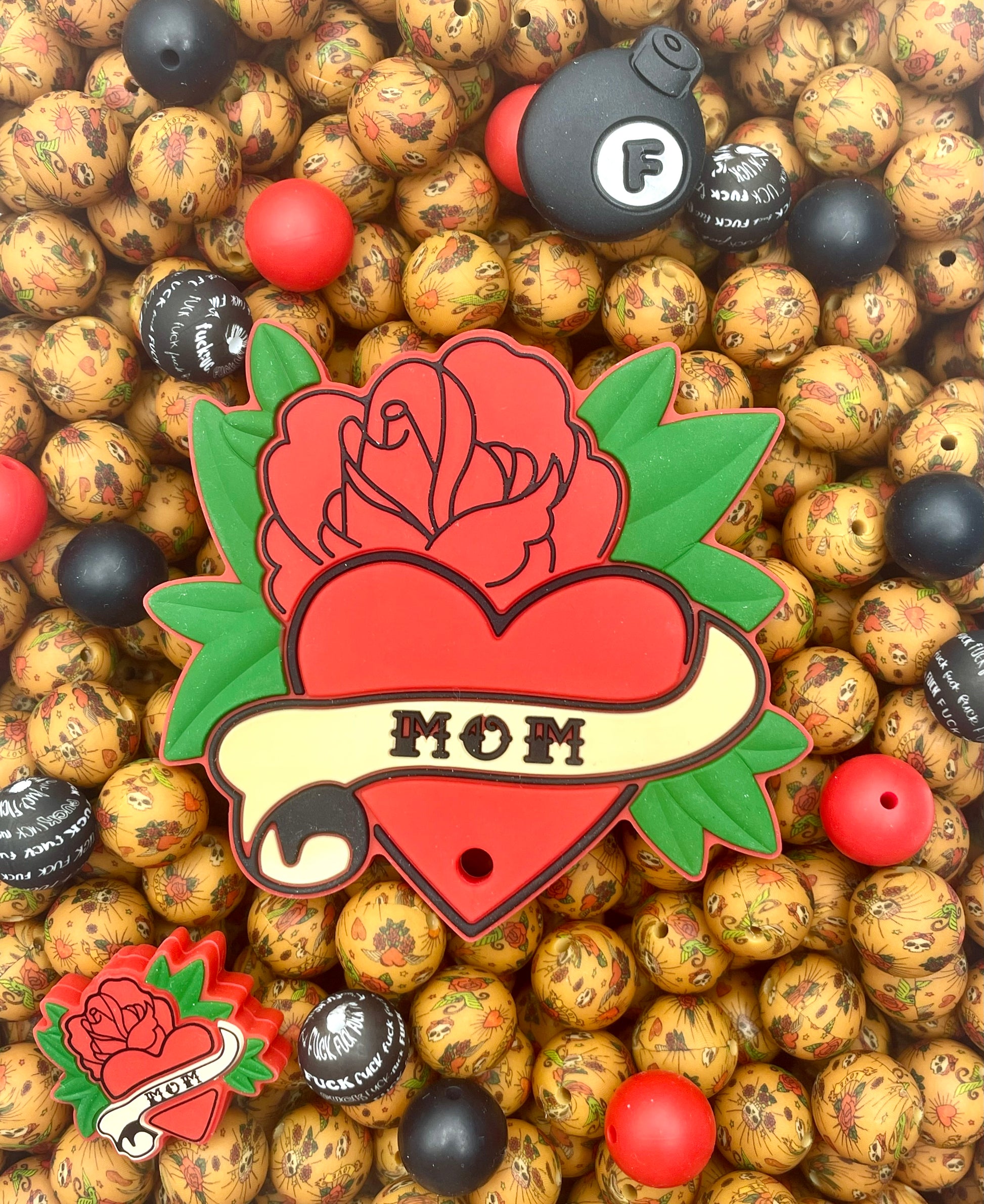 This Mix includes 1 Mom Tattoo Teether, 1 F Bomb Focal, 1 Mom Tattoo Focal, 5 Tattoo Printed 15mm, 5 Fuck printed 15mm, 5 Scarlett 15mm, 5 Black 15mm beads.