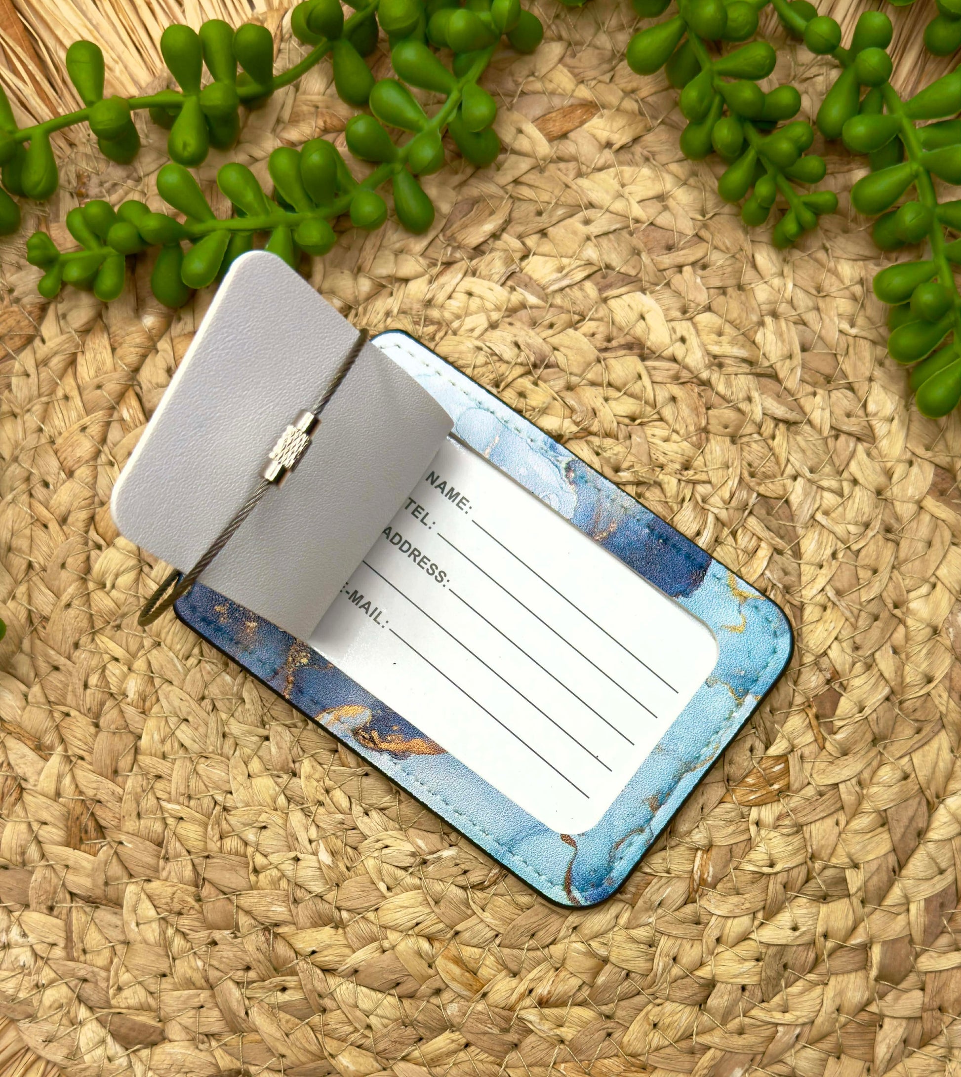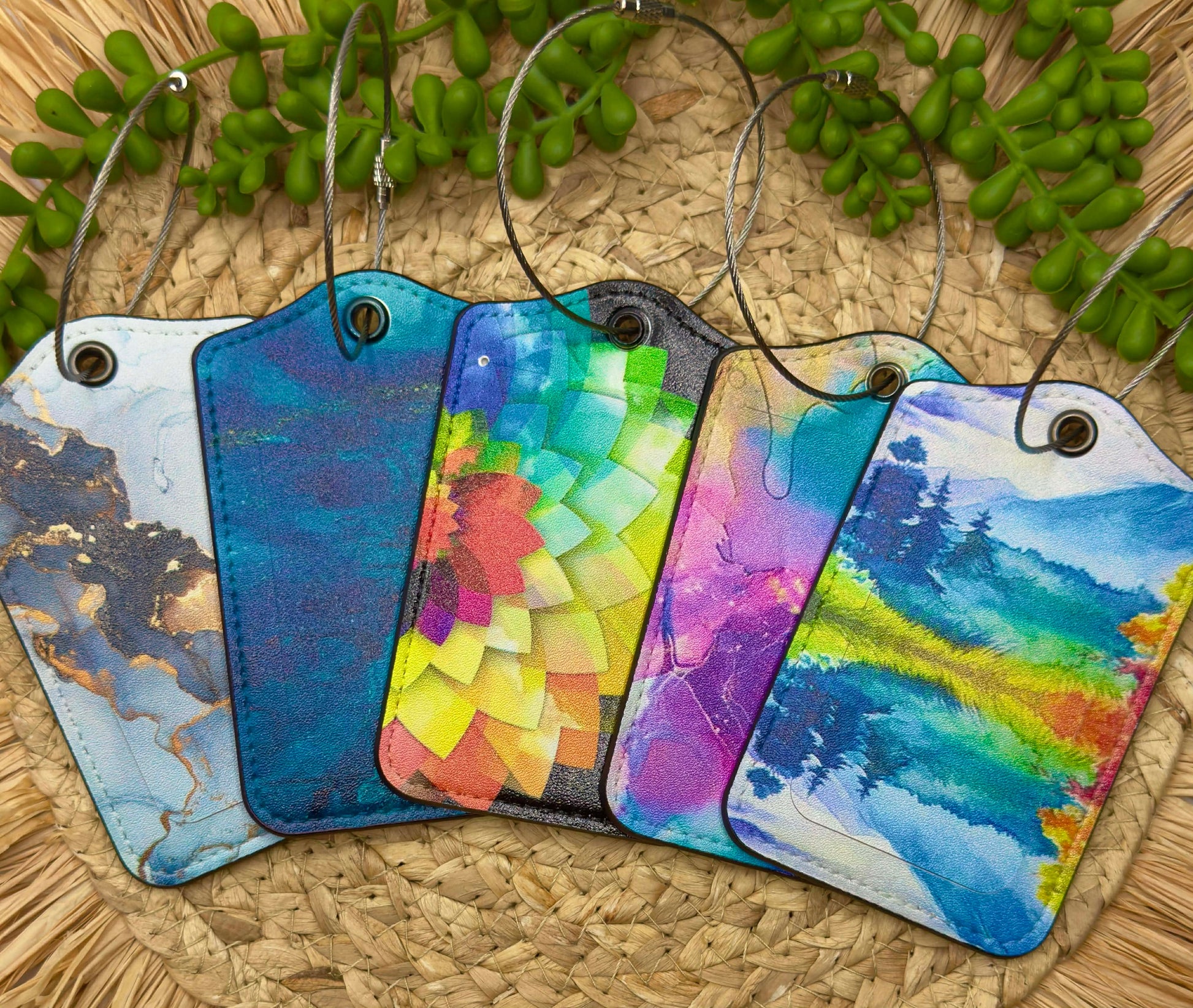 These luggage tags are sold individually. They are the perfect addition to any suitcase! Made with faux leather and metal snaps.