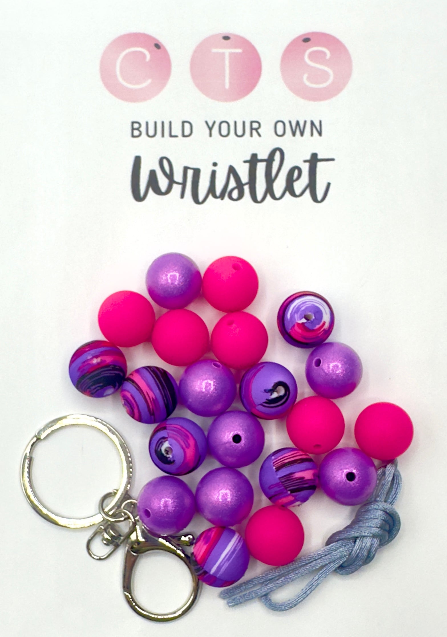 This kit includes all items shown in photo, 7 Watercolor Swirl, 7 Fuchsia, 7 Purple Opal beads, 1 Key Ring & approximately 3 feet of cord.